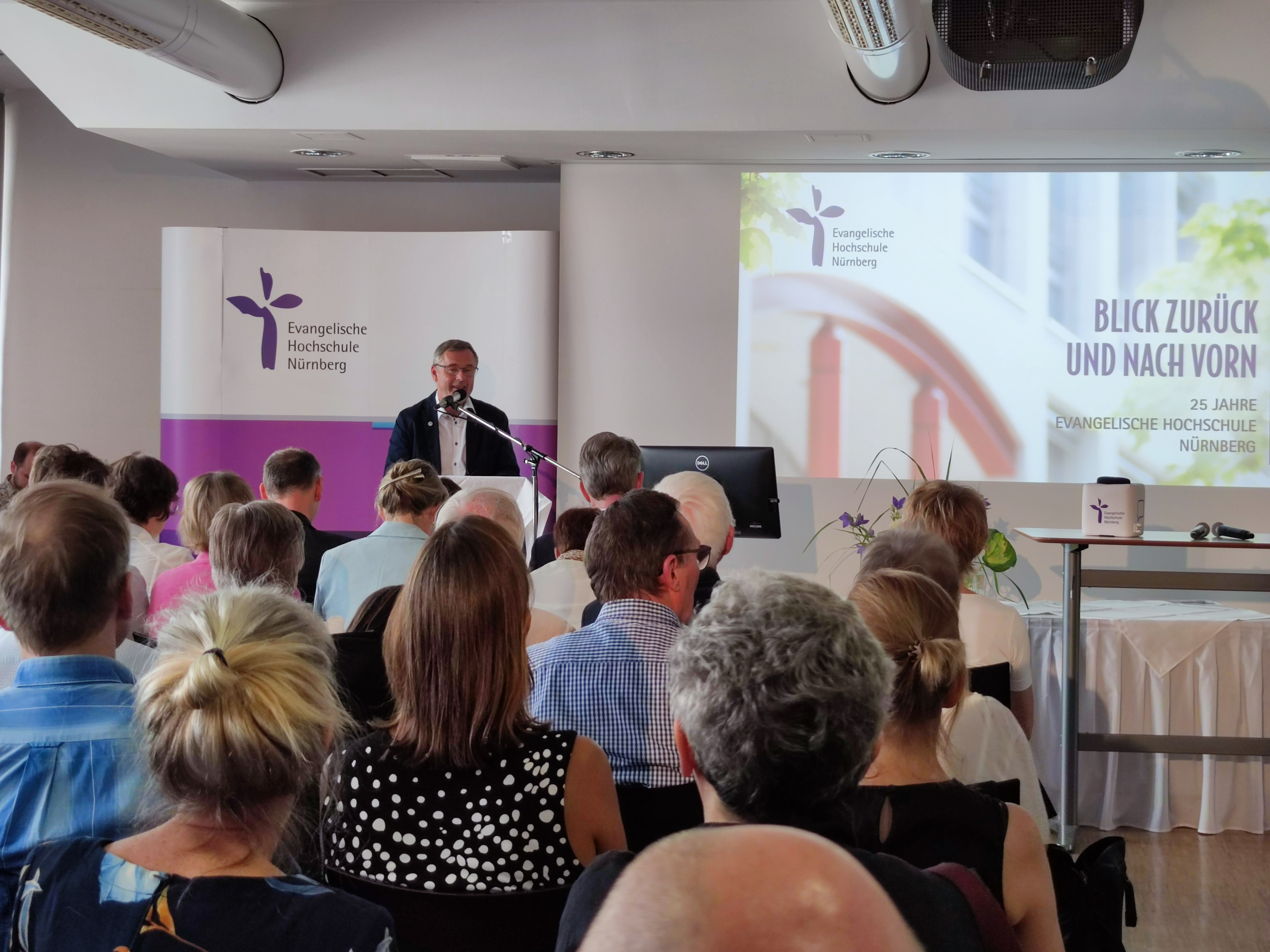 Wir haben gefeiert: 25 Jahre Evangelische Hochschule Nürnberg unter einem Dach! Das war nicht nur ein Umzug vor einem Vierteljahrhundert, sondern die nicht ganz einfache Zusammenlegung dreier Fachhochschulen bzw. Studiengängen. Bayerns Staatsminister für Wissenschaft und Kunst, Markus Blume, betonte in seinem Grußwort den "dringend notwendigen Bedarf an Menschen, die bereit sind, anderen zu helfen" - genau diese bildet die EVHN aus, und das sehr erfolgreich auch dual.